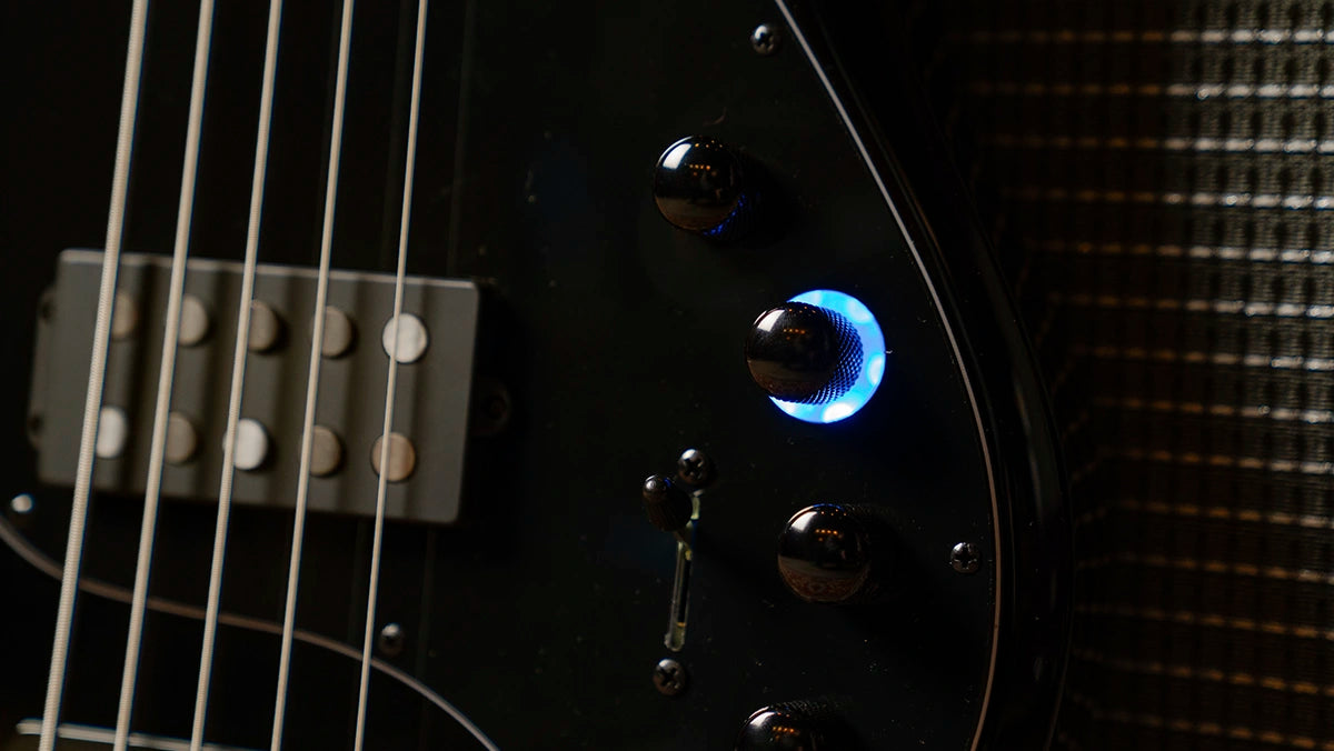 Flip the 3-way switch, and a glowing LED ring signals your mode—red for Alpha, blue for Omega. Switch to preamp-only for an ultra-clean tone, plus volume, treble, and bass controls.