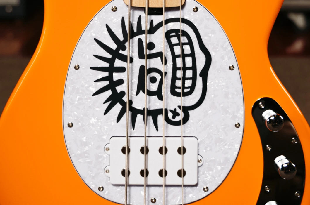 A longtime StingRay player, Herrera has dialed in the bass to his exact specs. It’s road-ready and impossible to miss, with a color-matched Orange Creamsicle headstock and a white pearloid pickguard featuring the iconic MxPx “Pokinatcha” graphic.