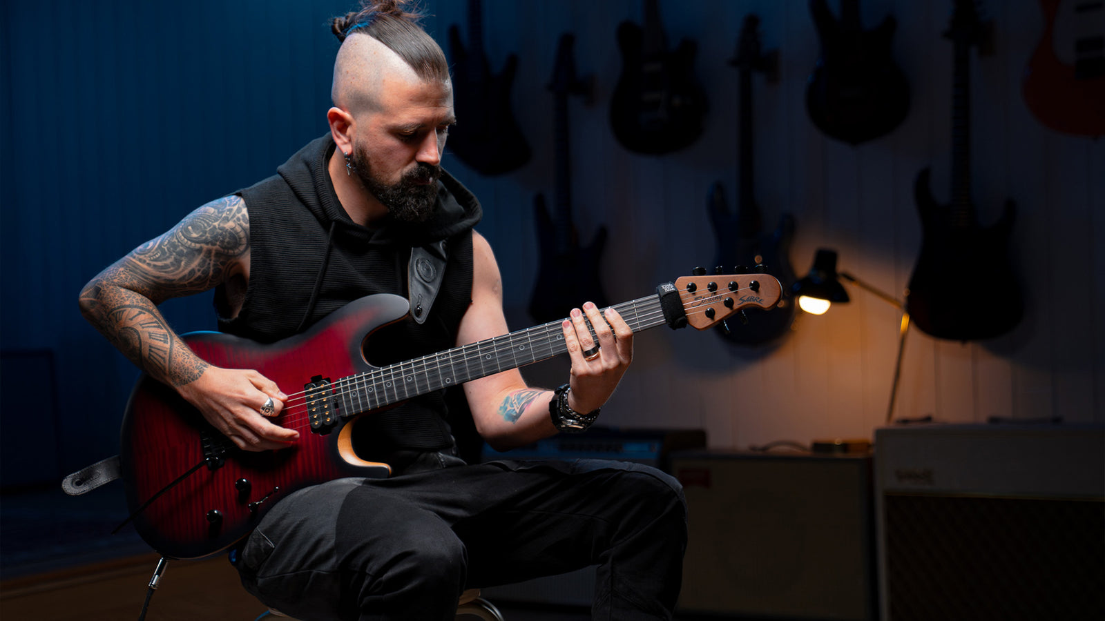 We refined the already perfectly balanced, double-cutaway Sabre and enhanced it with custom touches from Rabea, including a thicker tapered neck and recessed carve on the front and back lower horn for effortless access to all 22 frets.